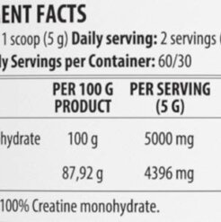 Καθαρή μονοϋδρική κρεατίνη σε μορφή σκόνης που συμβάλλει στην αύξηση της σωματικής απόδοσης με διαδοχικές εκρήξεις ενέργειας σε μικρής διάρκειας και υψηλής έντασης ασκήσεις. Προσφέρει δύναμη & αντοχή, ενώ επιταχύνει την αποθεραπεία.